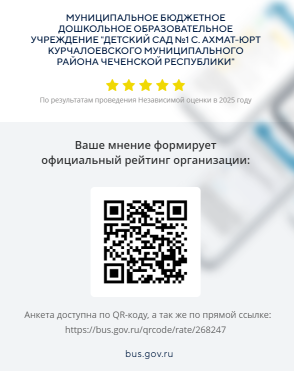 Наименование учреждения: Муниципальное бюджетное дошкольное образовательное учреждение «Детский сад №1 с. Ахмат-юрт Курчалоевского района" Муниципальни бюджетни школазхойн дешаран учреждени "Курчалойн кIоштан Ахьмад-Юьртан № 1 йолу берийн беш"