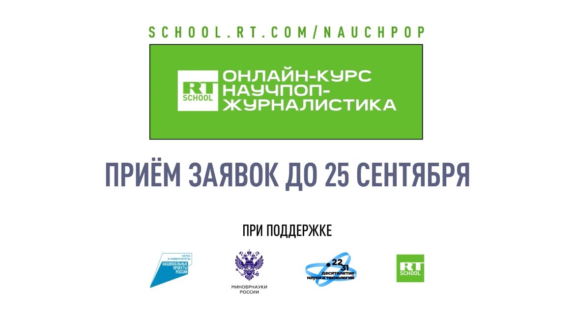 С 11 сентября 2023 года начался прием заявок на участие в курсе «Научпоп-журналистика». Заявки принимаются на сайте https://school.rt.com/nauchpop/ до 25 сентября 2023 г.