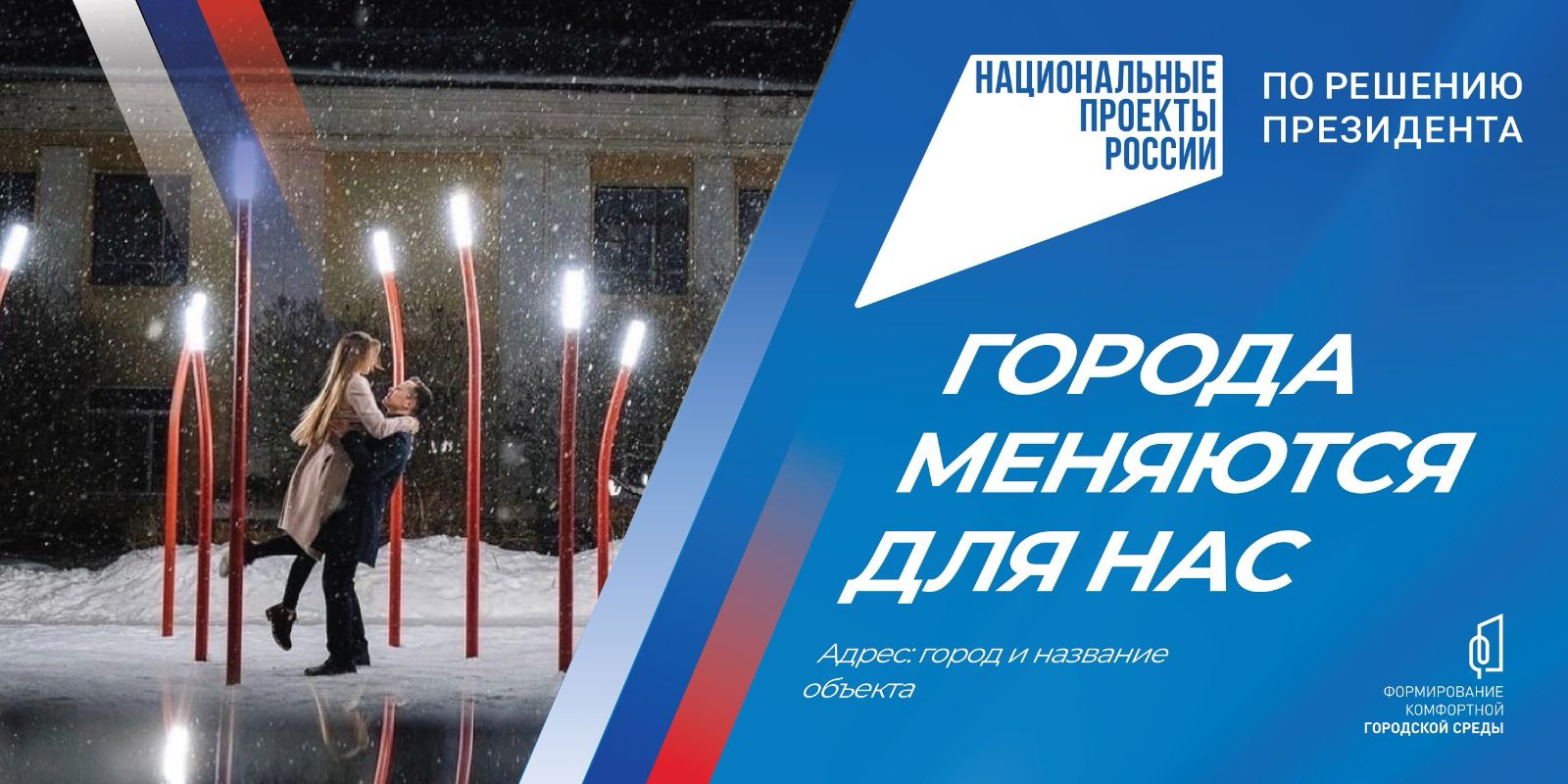 Основная задача федерального проекта «Формирование комфортной городской среды» национального проекта «Жилье и городская среда» — дать новый импульс развитию муниципалитетов в России. В рамках проекта благоустраиваются общественные пространства (набережные, места отдыха, парки, скверы, улицы, спортивные площадки и др.), а также реализуются проекты Всероссийского конкурса лучших проектов создания комфортной городской среды.